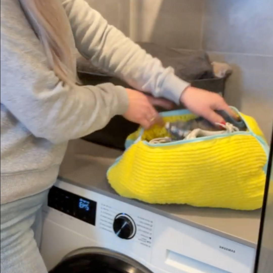 Simply place your shoe inside the laundry bag. Add some laundry detergent inside and outside the bag. Zip it up & and toss it in the washing machine.